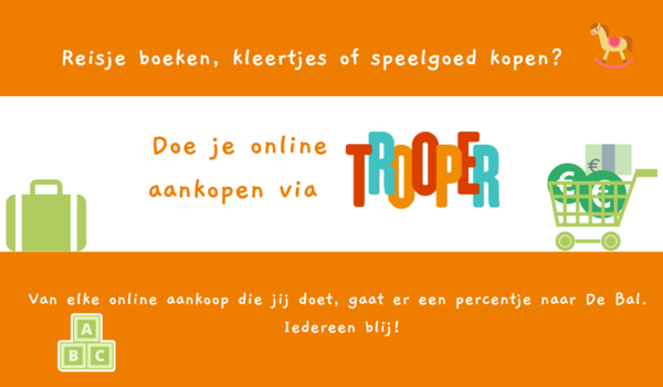 Ongetwijfeld doe ook jij wel eens een online aankoop. Een nieuw speelgoedje, een reisje, kleertjes, … Wanneer je eerst via het platform Trooper passeert vooraleer je jouw online winkelmandje vult, steun je De Bal zonder dat het jou een centje meer kost.
