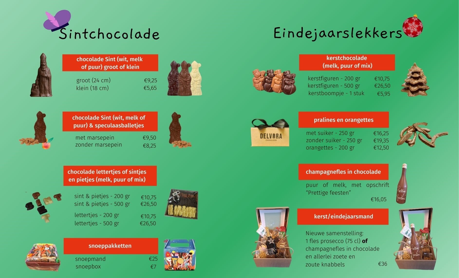Onder ons traditionele Sintaanbod vind je de heerlijke chocolade van Delvora en snoeppakketjes terug:
