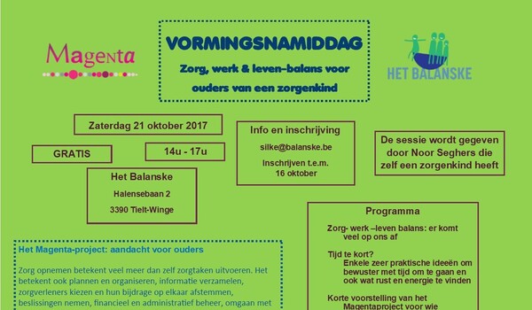 Op 21 oktober kan je als ouder de vorming 'zorg-, werk- en leven-balans van ouders met een zorgenkind' bijwonen. Jouw kind kan tijdens deze vorming aansluiten bij onze Spelnamiddag en Clubactiviteit, die eveneens op deze dag zal plaatsvinden. Alle informatie vind je in de flyer.