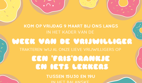 In de week van de vrijwilliger van 3 t.e.m. 11 maart 2018 zetten enkele organisaties, i.s.m. de gemeente Tielt-Winge hun deuren open om vrijwilligers en vrijwilligers in spé te laten kennismaken met hun werking. Zo kan je onder meer terecht in lokaal dienstencentrum Zonnedries, woonzorgcentrum Dommelhof en gezinsactiviteitencentrum Het Balanske. Tevens nodigt het Balanske op vrijdag 9 maart alle vrijwilligers uit voor een gezellig bedankingsmomentje!