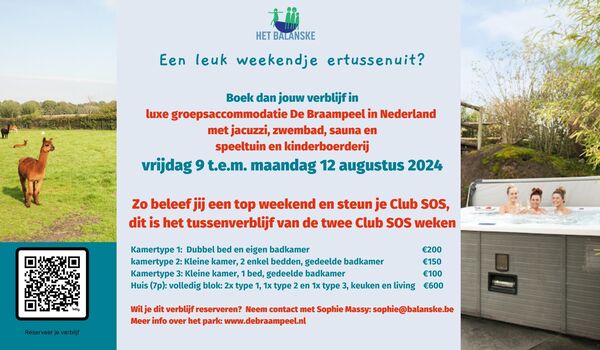 Onze CLUB SOS vakantie 2024 gaat naar De Braampeel in Nederland. Tijdens deze twee aparte vakantieweken staat het verblijf in het weekend van 9 tot 12 augustus. Jij kan er verblijven en genieten van luxe en rust.